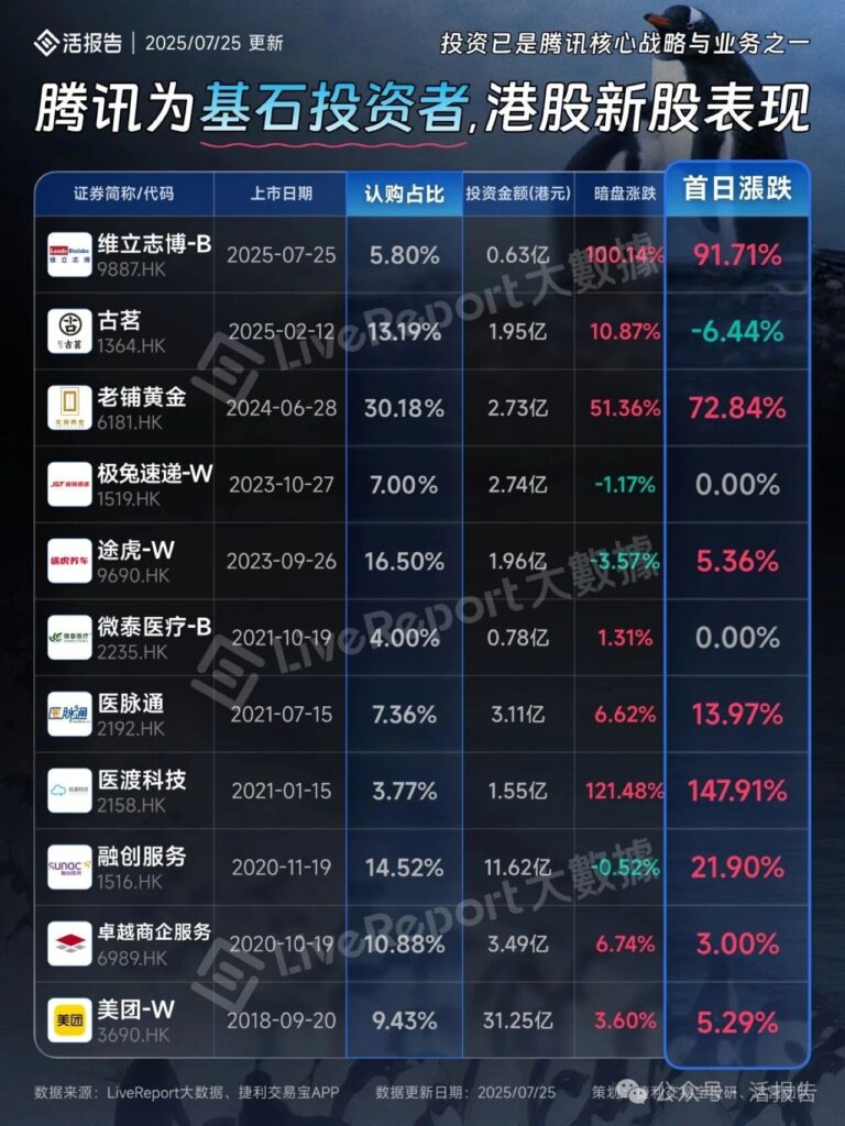 投资已成为腾讯核心战略与业务之一,腾讯参与了众多港股新股投资,涉及不同行业、不同时期上市的企业。多数新股首日有不同程度上涨,像医渡科技首日涨幅高达 147.91%,维立志博 – B 首日涨幅也达 91.71%,老铺黄金首日涨幅 72.84%,显示出部分投资标的在上市首日有较好的市场表现;但也有个别新股首日下跌,如古茗首日下跌 6.44%。