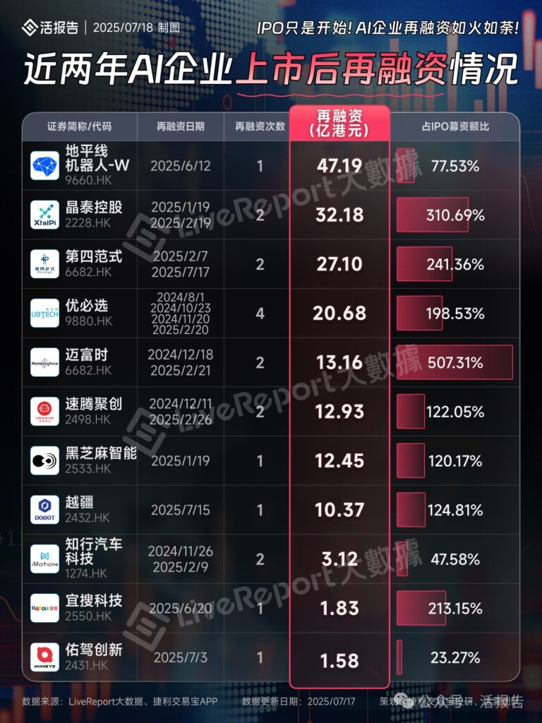 近两年(截至 2025 年 7 月 17 日)部分 AI 企业上市后再融资的情况,能反映出 AI 企业在资本市场的融资动态与发展态势。从 “占 IPO 募资额比” 来看,不少企业再融资额超过了 IPO 募资额。迈富时占比高达 507.31%,晶泰控股、第四范式、优必选等占比也都在 198% 以上,这表明这些 AI 企业上市后仍有很强的资金需求,通过再融资进一步获取资金,可能用于技术研发、业务拓展等方面,以推动企业在 AI 领域的发展。不过也有像佑驾创新,占比仅 23.27%,相对较低。