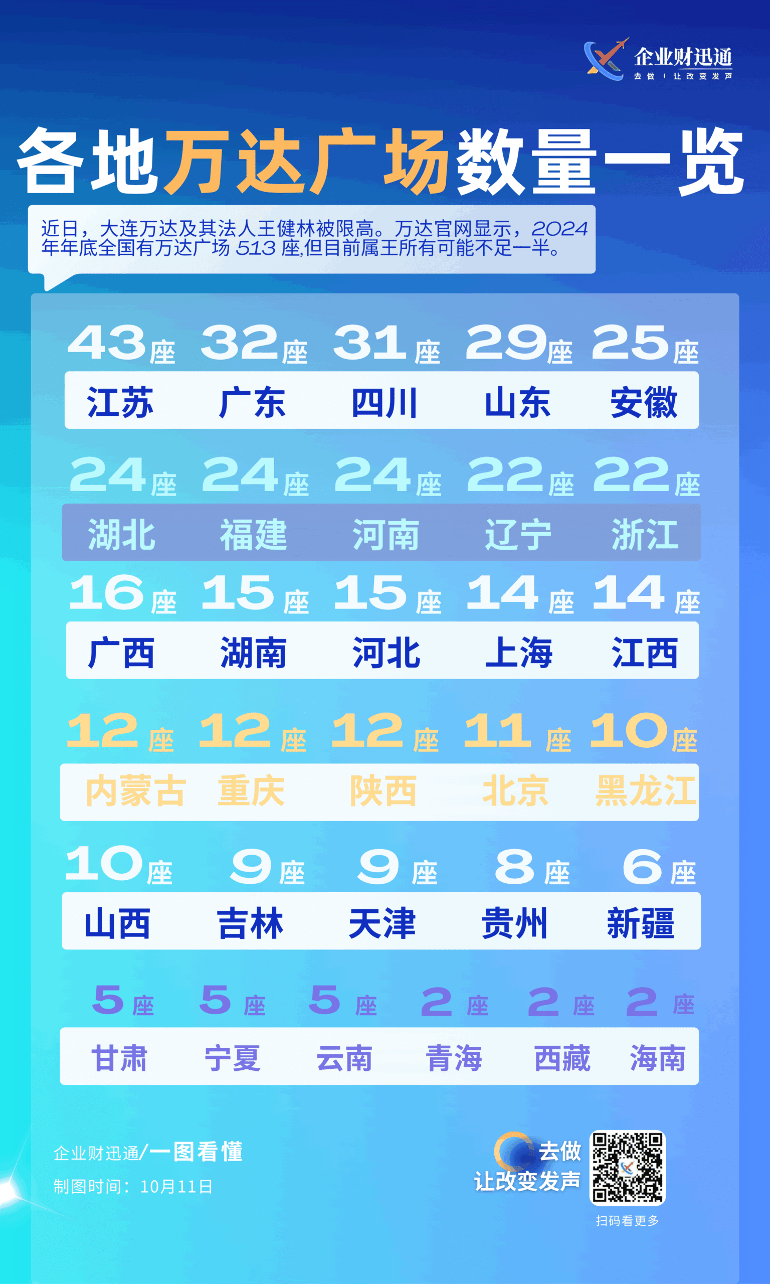 各地万达广场的数量情况,近日大连万达及其法人王健林被限高,万达官网显示 2024 年年底全国有万达广场 513 座,但目前属王所有可能不足一半。随后详细列出了不同省份、自治区、直辖市的万达广场数量,如江苏有 43 座,广东 32 座,四川 31 座等,涵盖了全国多个地区。