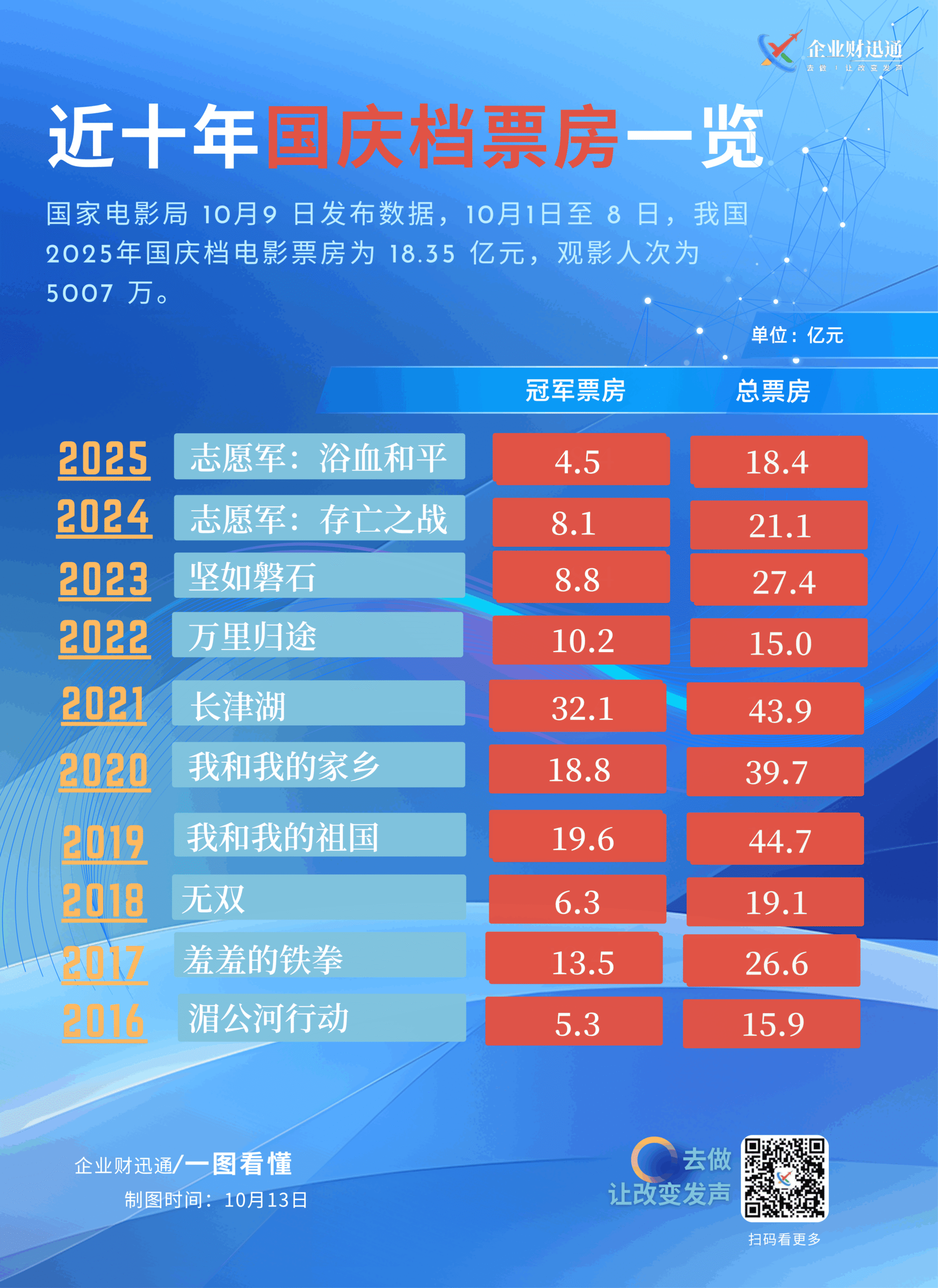 近十年(2016 – 2025 年)国庆档电影票房情况,国家电影局数据显示,2025 年 10 月 1 日 – 8 日国庆档票房为 18.35 亿元,观影人次 5007 万。图表中,每年都列出了国庆档冠军影片及其票房,还有当年国庆档总票房,单位为亿元。像 2021 年《长津湖》以 32.1 亿元的冠军票房,带动总票房达 43.9 亿元;2019 年《我和我的祖国》冠军票房 19.6 亿元,总票房 44.7 亿元等,不同年份票房有一定波动。