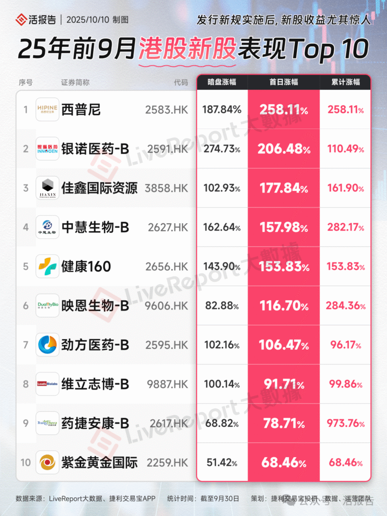 2025 年前 9 月港股新股表现 Top10 的情况,能看出发行新规实施后,新股收益颇为亮眼。