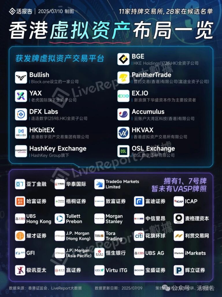 香港虚拟资产领域的布局情况,主要围绕虚拟资产交易平台的持牌情况展开。有 11 家获发牌的虚拟资产交易平台,像 Bullish(由 Block.one 设立)、YAX(老虎国际旗下全资子公司)等。同时还有 28 家在候选名单里,其中部分机构拥有 1、7 号牌,但暂未有 VASP 牌照,例如亚丁金融、华泰国际等。体现出香港在虚拟资产领域积极推进规范化发展,通过颁发牌照等方式引导行业健康有序运行,也反映出众多机构对香港虚拟资产市场的关注与布局热情,显示出该市场具有较大的发展潜力与吸引力。