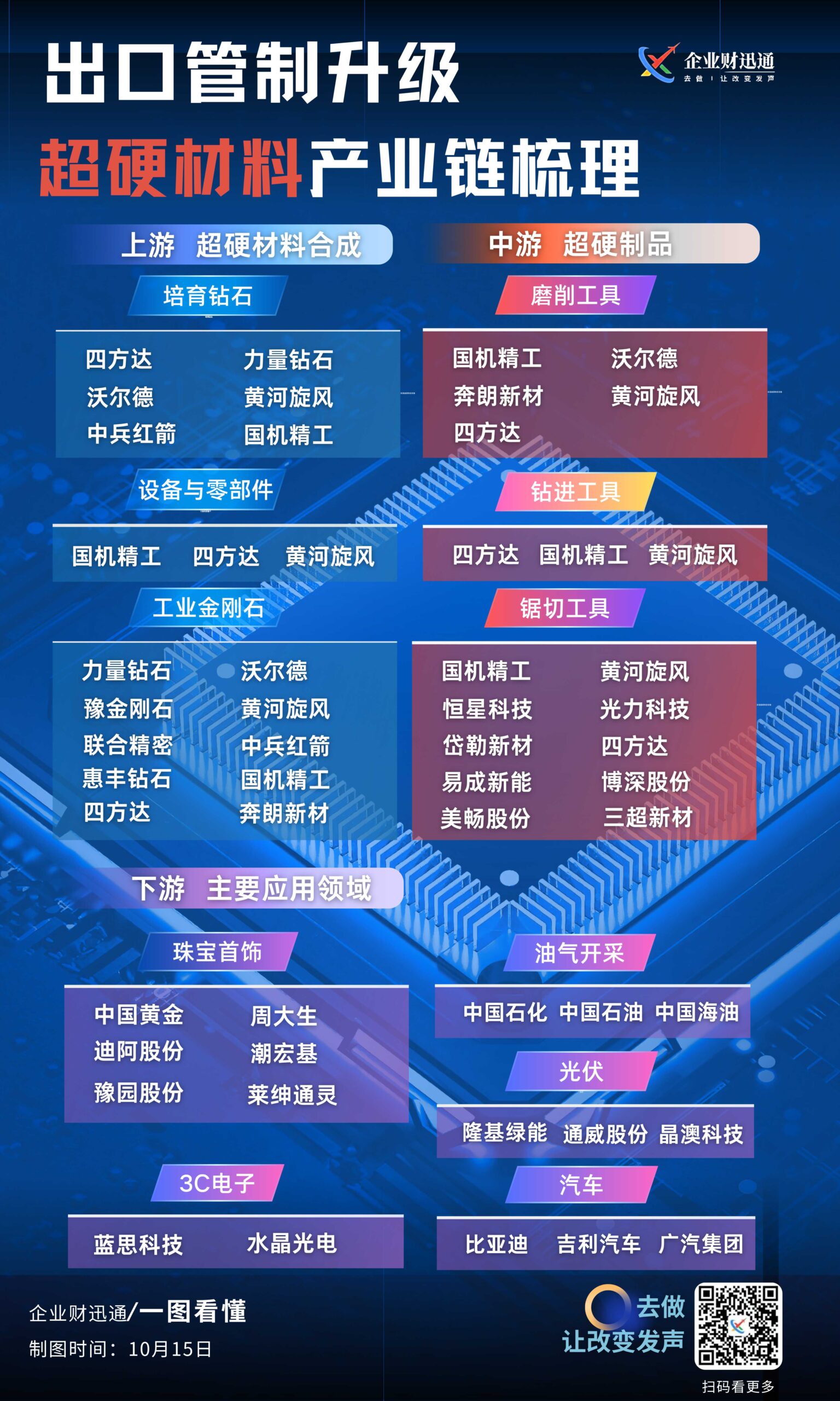 围绕 “出口管制升级”,对超硬材料产业链进行了梳理。从上游超硬材料合成(涵盖培育钻石、设备与零部件、工业金刚石等类别及相关企业),到中游超硬制品(包含磨削、钻进、锯切工具等及对应企业),再到下游主要应用领域(如珠宝首饰、油气开采、3C 电子、光伏、汽车等领域及相关企业),清晰呈现了超硬材料产业各环节的企业分布与关联。