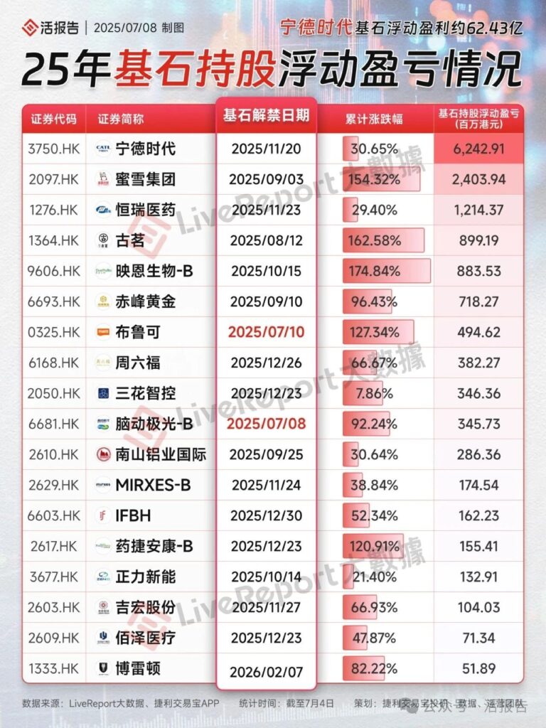 宁德时代基石浮动盈利约 62.43 亿港元,在所列企业中盈利规模居首,累计涨幅达 30.65%。蜜雪集团、古茗、映恩生物 – B 等企业的累计涨幅也较为可观,分别达到 154.32%、162.58%、174.84%,基石持股浮动盈利也处于较高水平,反映出这些企业在市场上的良好表现,可能受到投资者的青睐。