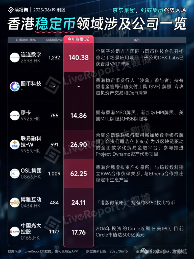 香港稳定币领域涉及的部分公司情况,包含连连数字、圆币科技、移卡等企业。从内容看,列出了各公司的证券简称与代码、总市值、今年涨幅,还通过备注说明了公司在稳定币相关业务或布局上的特点,像连连数字子公司开展稳定币市场应用项目且获相关牌照,OSL 集团作为合规虚拟资产交易所与其他企业在稳定币方面有合作等,同时提及京东集团、蚂蚁集团强势入场,展现出香港稳定币领域的参与主体及相关发展态势。