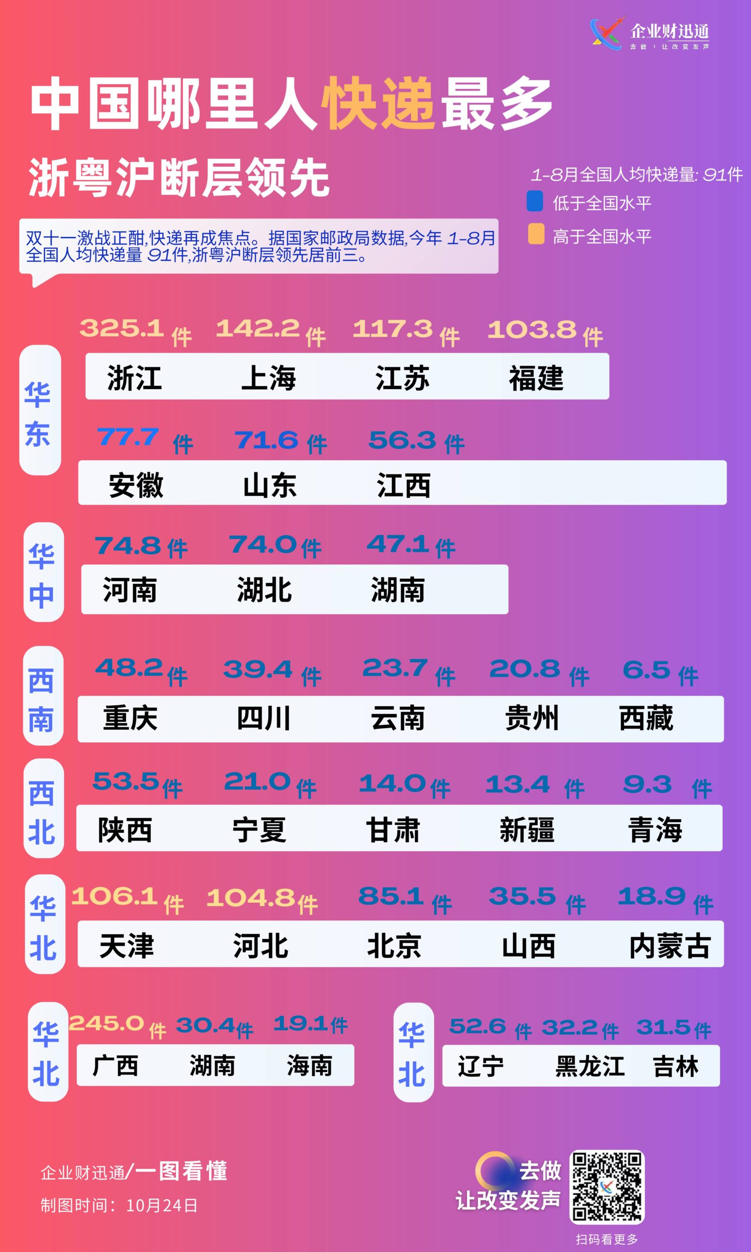 快递量的区域分布与地区经济发展水平、电商活跃度密切相关。浙沪粤(广西) 等经济发达、电商产业繁荣的地区人均快递量显著领先,而中西部、东北及部分欠发达地区快递消费相对低迷,反映出区域经济和消费习惯的差异对快递行业的影响。