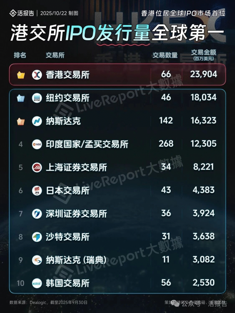 截至 2025 年 9 月 30 日全球主要交易所的 IPO(首次公开募股)情况,数据来源于 Dealogic。其中,香港交易所 IPO 交易量全球第一,交易数量为 66,交易金额达 239.04 亿美元。其他进入前十的交易所还包括纽约交易所、纳斯达克、印度国家 / 孟买交易所、上海证券交易所、日本交易所、深圳证券交易所、沙特交易所、纳斯达克(瑞典)和韩国交易所,各交易所在交易数量和交易金额上呈现出不同的表现。