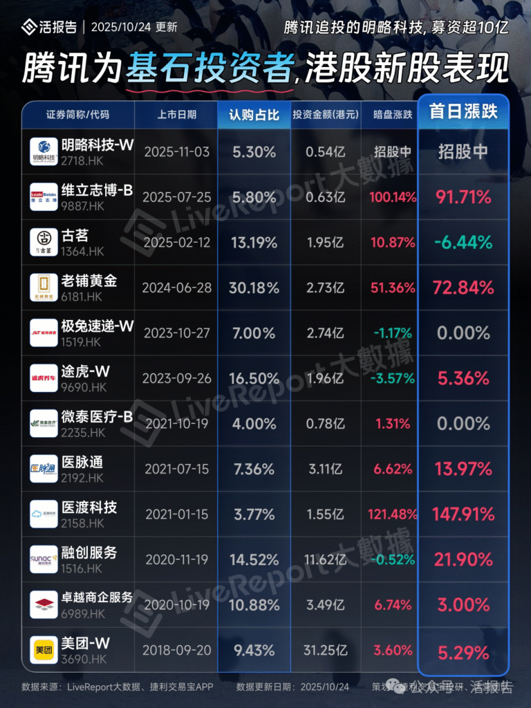 腾讯作为基石投资者参与的多只港股新股的表现情况,包含以下关键信息: 时间范围:涵盖 2018 年至 2025 年(部分新股仍在招股中)。 核心数据维度:证券简称及代码、上市日期、腾讯认购占比、投资金额(港元)、暗盘涨跌、首日涨跌。 典型案例: 首日涨幅较高的如医渡科技(2158.HK),首日涨 147.91%;维立志博 – B(9887.HK)首日涨 91.71%。 也有首日下跌的情况,如古茗(1364.HK)首日跌 6.44%。 还有部分新股首日涨跌为 0,如极兔速递 – W(1519.HK)、微泰医疗 – B(2235.HK)。 图片数据来源:活报告