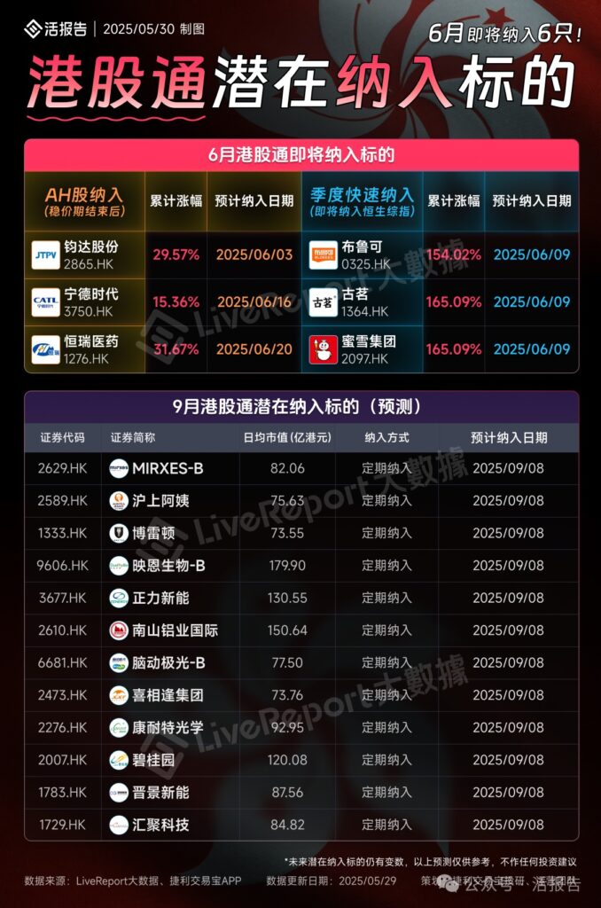港股通潜在纳入标的的信息汇总,分为两部分: 6 月港股通即将纳入标的: AH 股纳入(稳价期结束后):钧达股份(2865.HK)、宁德时代(3750.HK)、恒瑞医药(1276.HK),分别预计于 2025 年 6 月 3 日、6 月 16 日、6 月 20 日纳入,累计涨幅分别为 29.57%、15.36%、31.67%。 季度快速纳入(即将纳入恒生综指):布鲁可(0325.HK)、古茗(1364.HK)、蜜雪集团(2097.HK),均预计于 2025 年 6 月 9 日纳入,累计涨幅分别为 154.02%、165.09%、165.09%。 9 月港股通潜在纳入标的(预测):包含 MIRXES-B(2629.HK)、沪上阿姨(2589.HK)、博雷顿(1333.HK)等 12 只标的,均为定期纳入,预计纳入日期为 2025 年 9 月 8 日,同时列出了各标的的日均市值(亿港元)。 图片数据来源:活报告