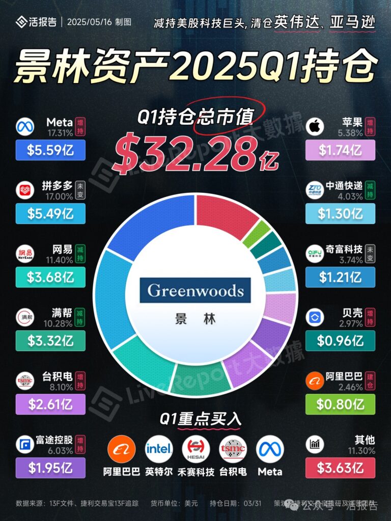 景林资产 2025Q1 美股持仓总市值 32.28 亿美元,重点增持 Meta、苹果、台积电等,未变拼多多、奇富科技持仓,减持网易、满帮等,建仓阿里巴巴;Q1 重点买入阿里、英特尔、禾赛科技、台积电、Meta,持仓覆盖科技、电商、物流等领域,科技互联网标的占比高,策略体现对产业趋势的判断与组合优化。