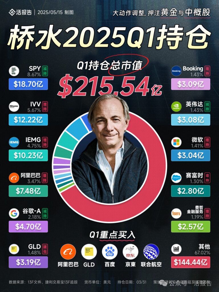 桥水基金 2025 年第一季度(Q1)美股持仓情况: 持仓总市值215.54 亿美元; 操作上,增持 IVV、IEMG、阿里巴巴、微软等,减持 SPY、英伟达、谷歌 – A 等,建仓 GLD(黄金 ETF); Q1 重点买入阿里巴巴、GLD、百度、京东、联合航空,押注黄金与中概股; 持仓覆盖指数基金、科技、电商等领域,“其他” 类别占比 67.02%,体现持仓分散性。 图片数据来源:活报告