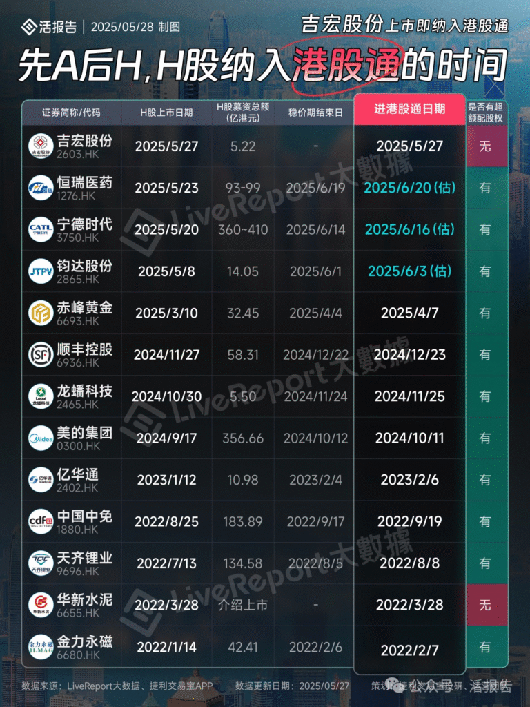 其中,吉宏股份(2603.HK)和华新水泥(6655.HK)在 H 股上市当日即纳入港股通且无超额股权,而其他多数公司在 H 股上市后经过一段时间(如稳价期后)才纳入港股通且存在超额股权,不同公司的 H 股募资规模、上市及纳入港股通的时间跨度也各有差异。