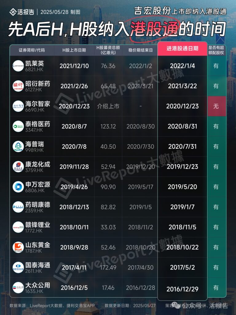 其中,多数企业 H 股上市后需经过一段时间(如稳价期后)才纳入港股通且存在超额股权;仅吉宏股份、华新水泥、海尔智家三家是 H 股上市当日即纳入港股通,且吉宏股份、华新水泥无超额股权,海尔智家也无超额股权。