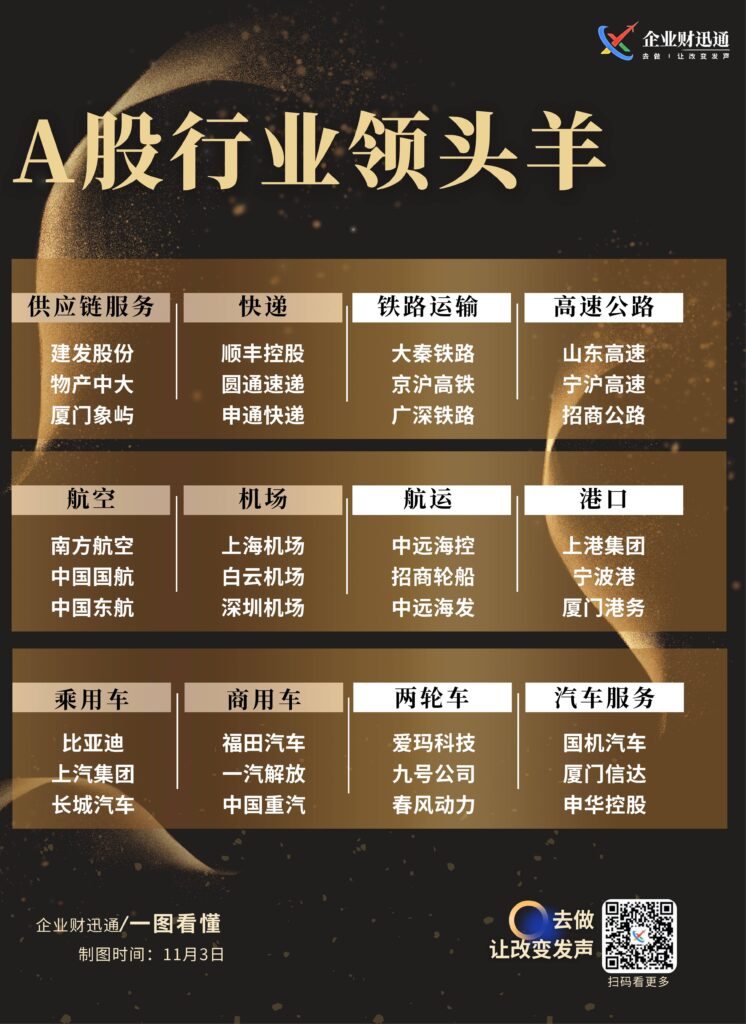 《A 股行业领头羊》信息图,梳理了 A 股市场中多个行业的领军企业,涵盖供应链服务、快递、铁路运输、高速公路、航空、机场、航运、港口、乘用车、商用车、两轮车、汽车服务等领域,每个领域都列出了具有代表性的 3 家企业,例如供应链服务领域的建发股份、物产中大、厦门象屿,快递领域的顺丰控股、圆通速递、申通快递等,帮助投资者或关注 A 股市场的人群快速了解各行业的头部企业布局。