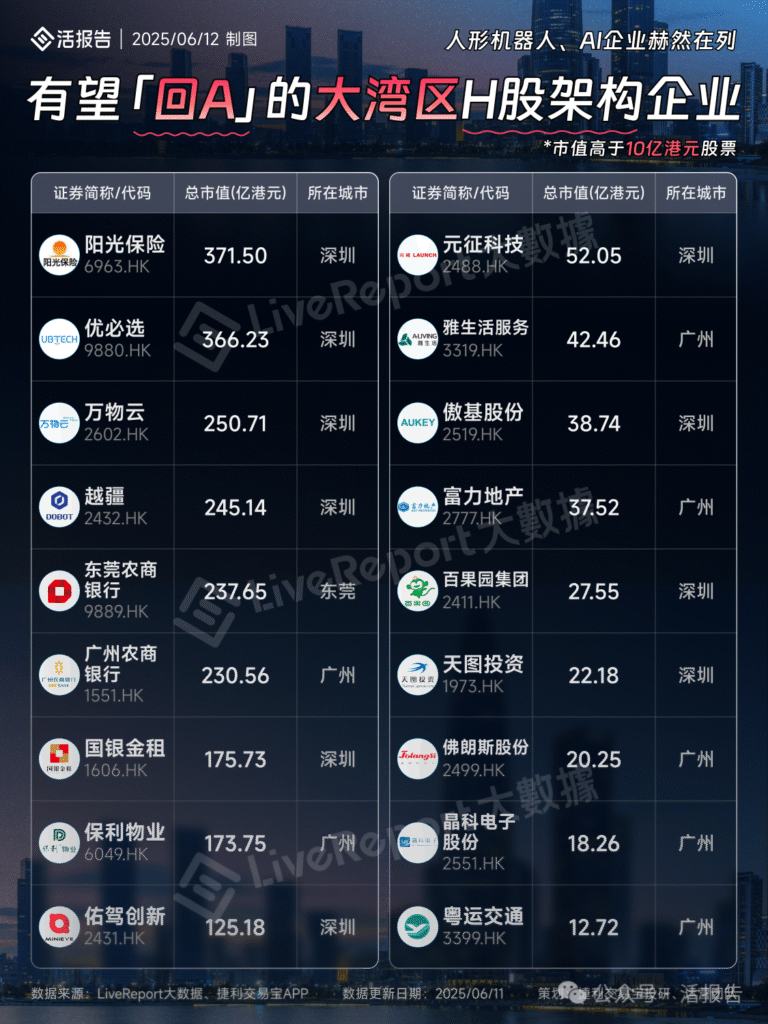一批市值高于 10 亿港元的大湾区 H 股架构企业有望 “回 A”,涵盖深圳、广州、东莞等城市的多家企业,涉及保险、机器人、物业、金融、消费等多个领域,其中优必选(人形机器人)等 AI、人形机器人企业赫然在列,例如阳光保险(371.50 亿港元)、优必选(366.23 亿港元)等企业总市值位居前列。