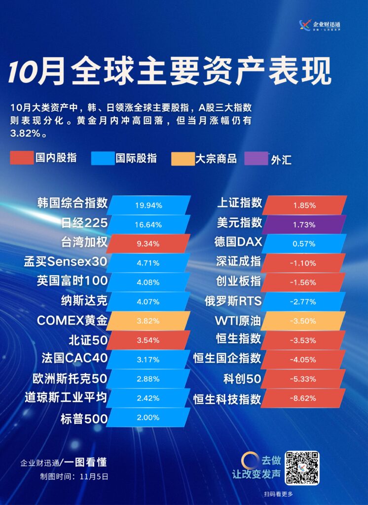 10 月全球主要资产表现:其中,韩国综合指数以 19.94% 的涨幅领涨全球主要股指,日经 225 指数涨幅 16.64% 紧随其后;A 股三大指数表现分化,上证指数涨 1.85%,深证成指跌 1.10%,创业板指跌 1.56%;黄金(COMEX 黄金)月内冲高回落但仍有 3.82% 的涨幅;WTI 原油下跌 3.50%;港元资产表现较弱,恒生科技指数跌幅达 8.62%。资产类别涵盖国内股指、国际股指、大宗商品、外汇等,清晰呈现了 10 月全球主要资产的分化表现。