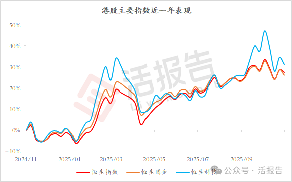 港股主要指数近一年(2024 年 11 月 – 2025 年 10 月左右)的表现,可从以下维度分析: