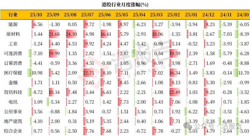 港股各行业的月度涨跌幅 (%),涵盖了从 24/10 到 25/10 多个月份的行业表现,涉及能源、原材料、工业、可选消费、日常消费、医疗保健、金融、资讯科技、电讯、公用事业、地产建筑、综合企业等多个行业。