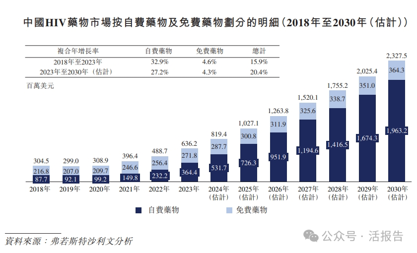2018 年至 2030 年中国 HIV 药物市场按自费药物和免费药物划分的明细,包含复合年增长率和市场规模(以百万美元计)两部分信息: