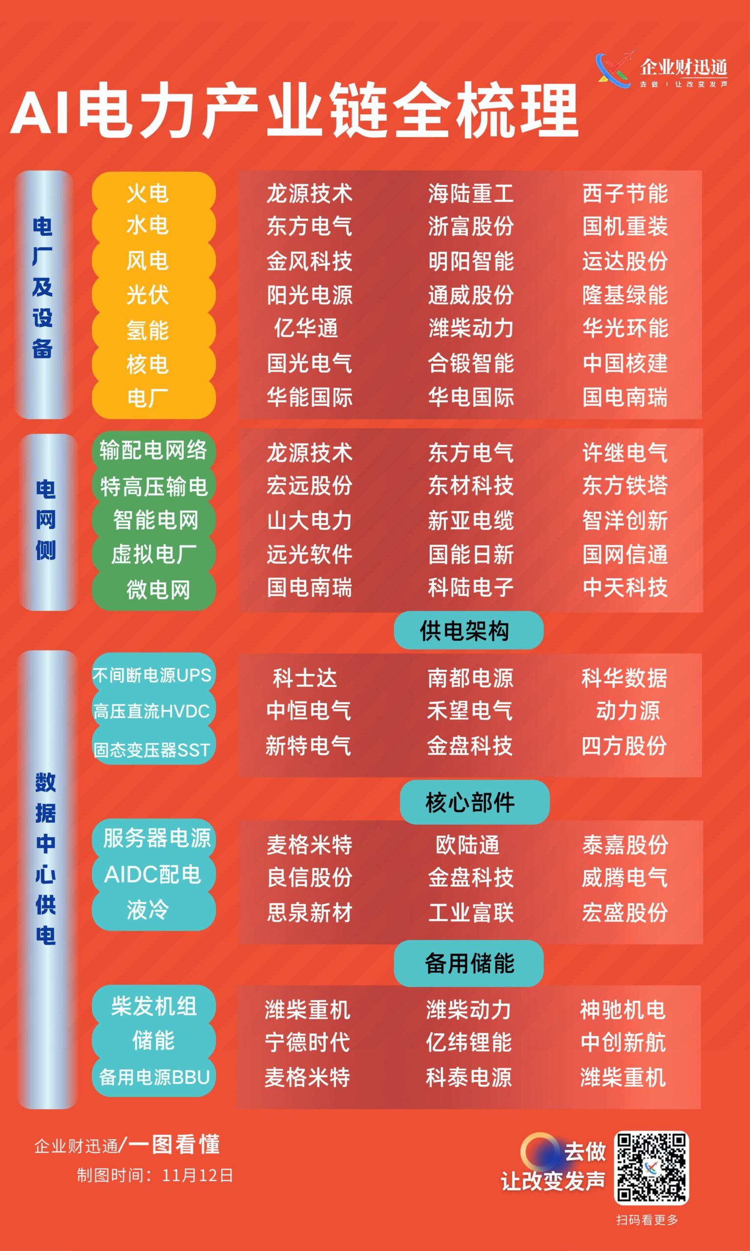 AI 电力产业链的全梳理,由 “企业财迅通” 制作,制图时间为 11 月 12 日。它从电厂及设备、电网侧、数据中心供电三个核心环节,详细划分了细分领域并列举了相关企业: