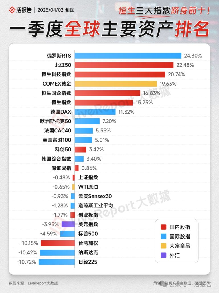 不同颜色区分资产类别(国内股指、国际股指、大宗商品、外汇),以百分比形式呈现各类资产的涨跌幅度。其中,俄罗斯 RTS 以 24.30% 的涨幅位居第一;国内的北证 50、恒生科技指数、恒生国企指数、恒生指数表现亮眼,跻身前列;而台湾加权、纳斯达克、日经 225 等资产则出现了较大幅度的下跌。整体来看,一季度全球主要资产表现分化明显,恒生系列指数在全球资产中表现突出,跻身前十。
