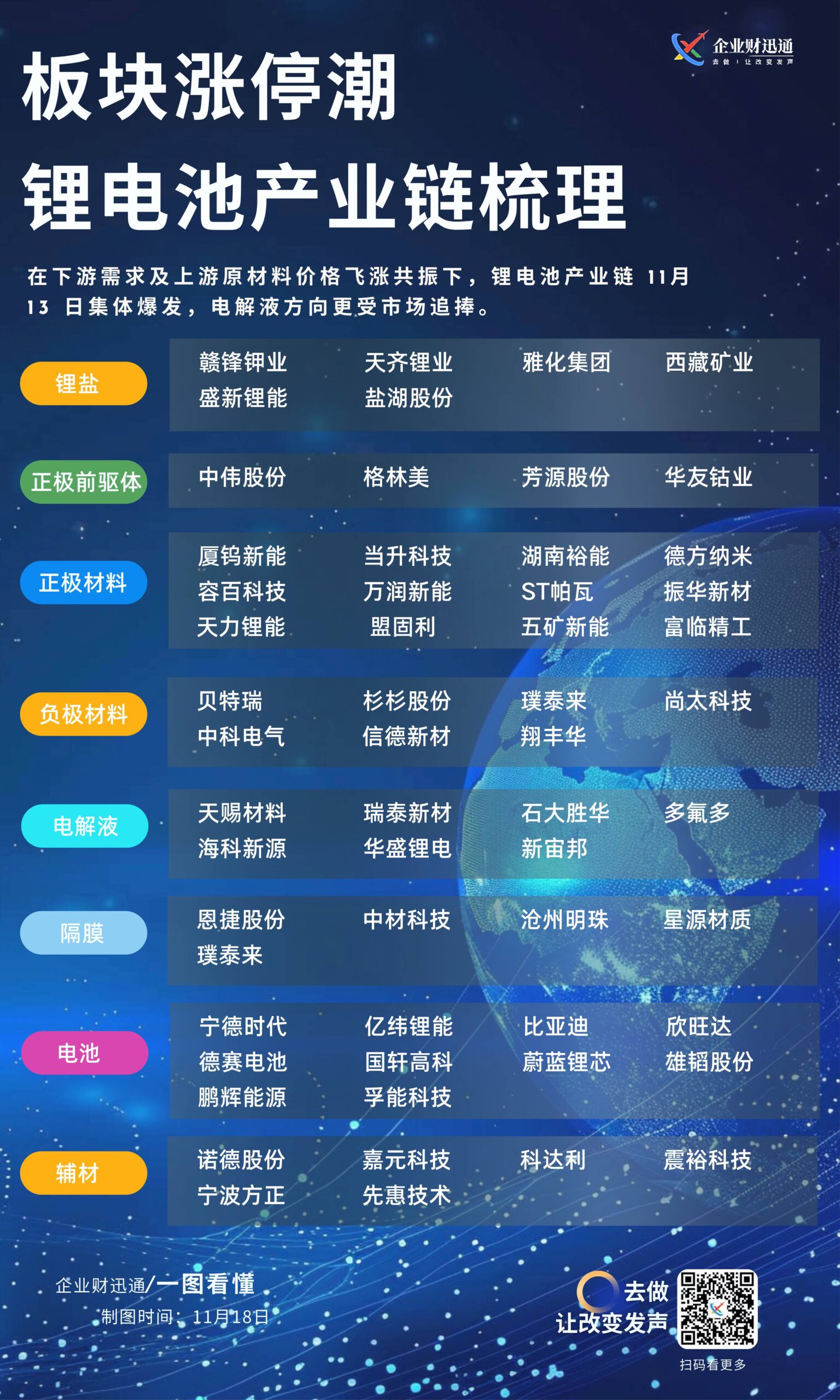 锂电池产业链的板块涨停潮梳理,展示了在下游需求与上游原材料价格飞涨的共振下,2025 年 11 月 13 日锂电池产业链各环节的相关企业。
