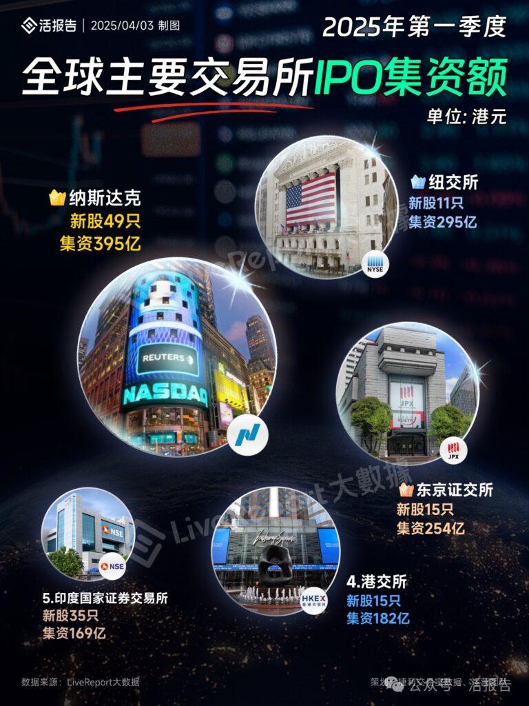 2025 年第一季度全球主要交易所的 IPO(首次公开募股)集资额情况,单位为港元。 纳斯达克:新股 49 只,集资 395 亿港元,在图中表现突出。 纽交所:新股 11 只,集资 295 亿港元。 东京证交所:新股 15 只,集资 254 亿港元。 港交所:新股 15 只,集资 182 亿港元。 印度国家证券交易所:新股 35 只,集资 169 亿港元。 图片数据来源:活报告