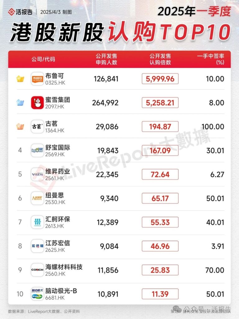 榜单展示了 10 家港股新股的公开发售申购人数、公开发售认购倍数和一手中签率(%)。其中,布鲁可(0325.HK)以 5,999.96 倍的公开发售认购倍数位居第一,申购人数 126,841 人,一手中签率 10.00%;蜜雪集团(2097.HK)紧随其后,认购倍数 5,258.21 倍,申购人数 264,992 人,一手中签率 8.00%;古茗(1364.HK)一手中签率达 100.00%。其余公司如舒宝国际、维昇药业等也在列。 图片数据来源:活报告