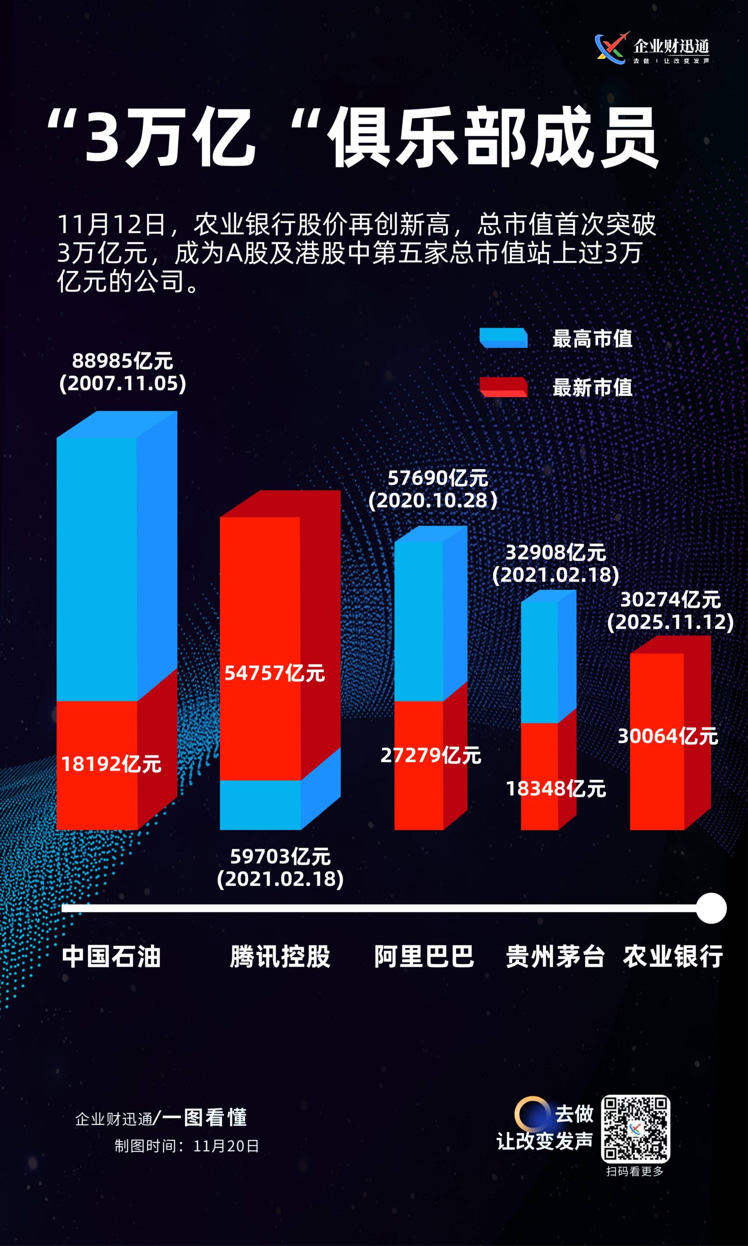2025 年 11 月 12 日,农业银行总市值首次突破 3 万亿元,成为 A 股及港股中第五家总市值站上 3 万亿元的公司。