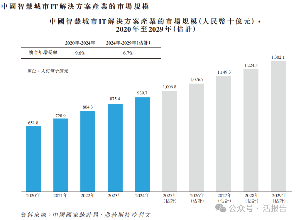2020 年至 2029 年中国智慧城市 IT 解决方案产业的市场规模(单位:人民币十亿元)及复合年增长率。