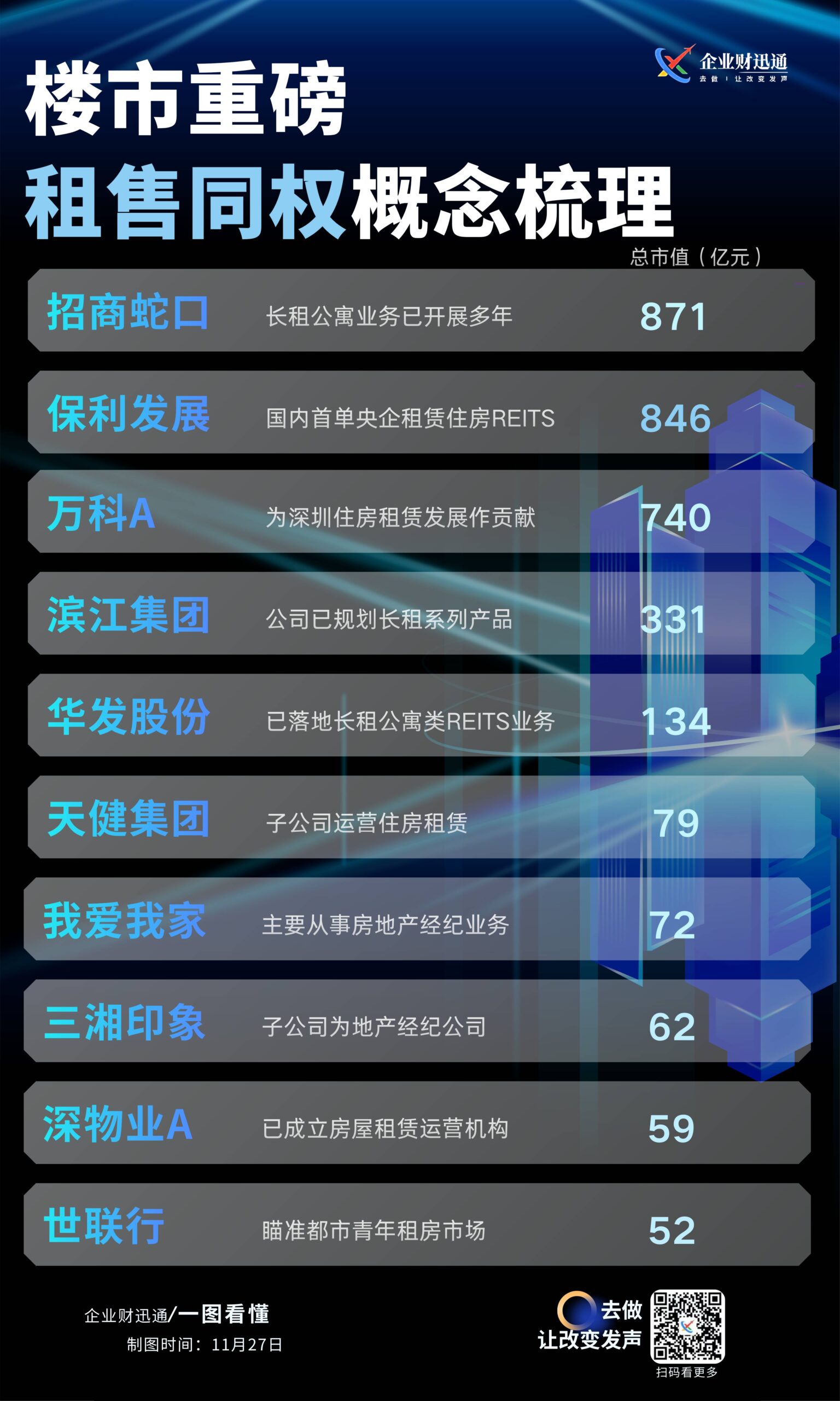 “租售同权” 概念下的房企梳理图,由 “企业财迅通” 制作(制图时间 11 月 27 日),核心展示了 10 家涉足住房租赁相关业务的房企信息: