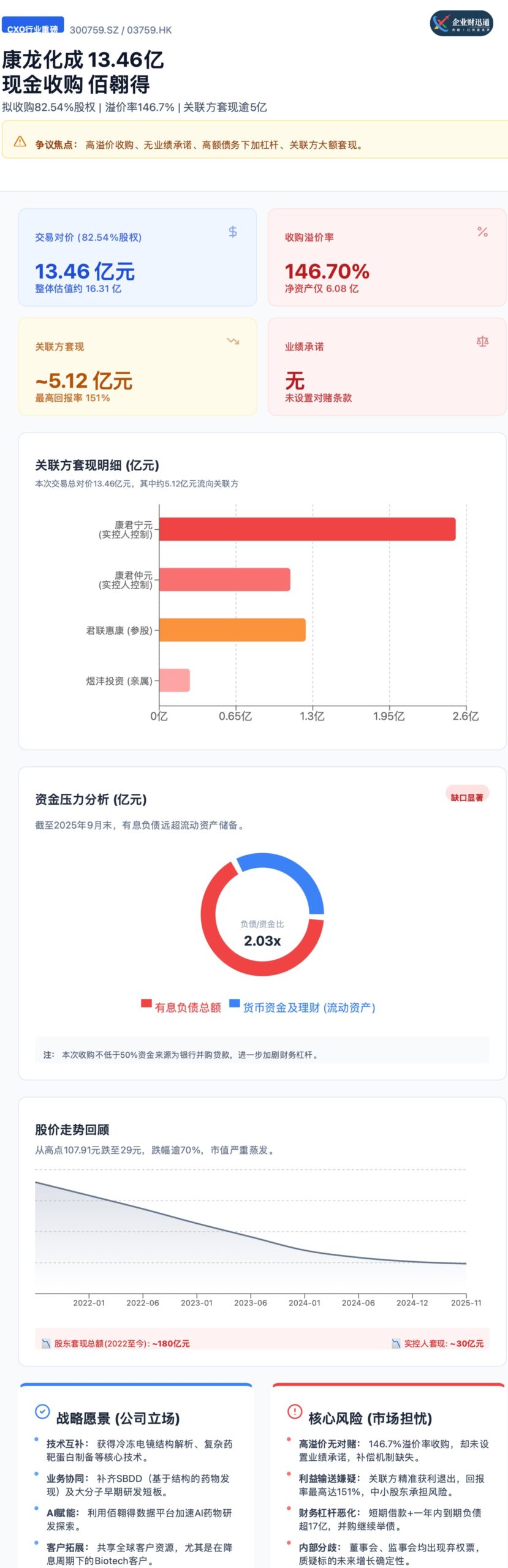 康龙化成拟以13.46亿元现金收购佰翱得82.54%股权,对应佰翱得整体估值约16.31亿元,较其净资产溢价约146.7%。公司解释称估值参考了过往融资价格,但交易未设置业绩承诺条款,引发市场关注。