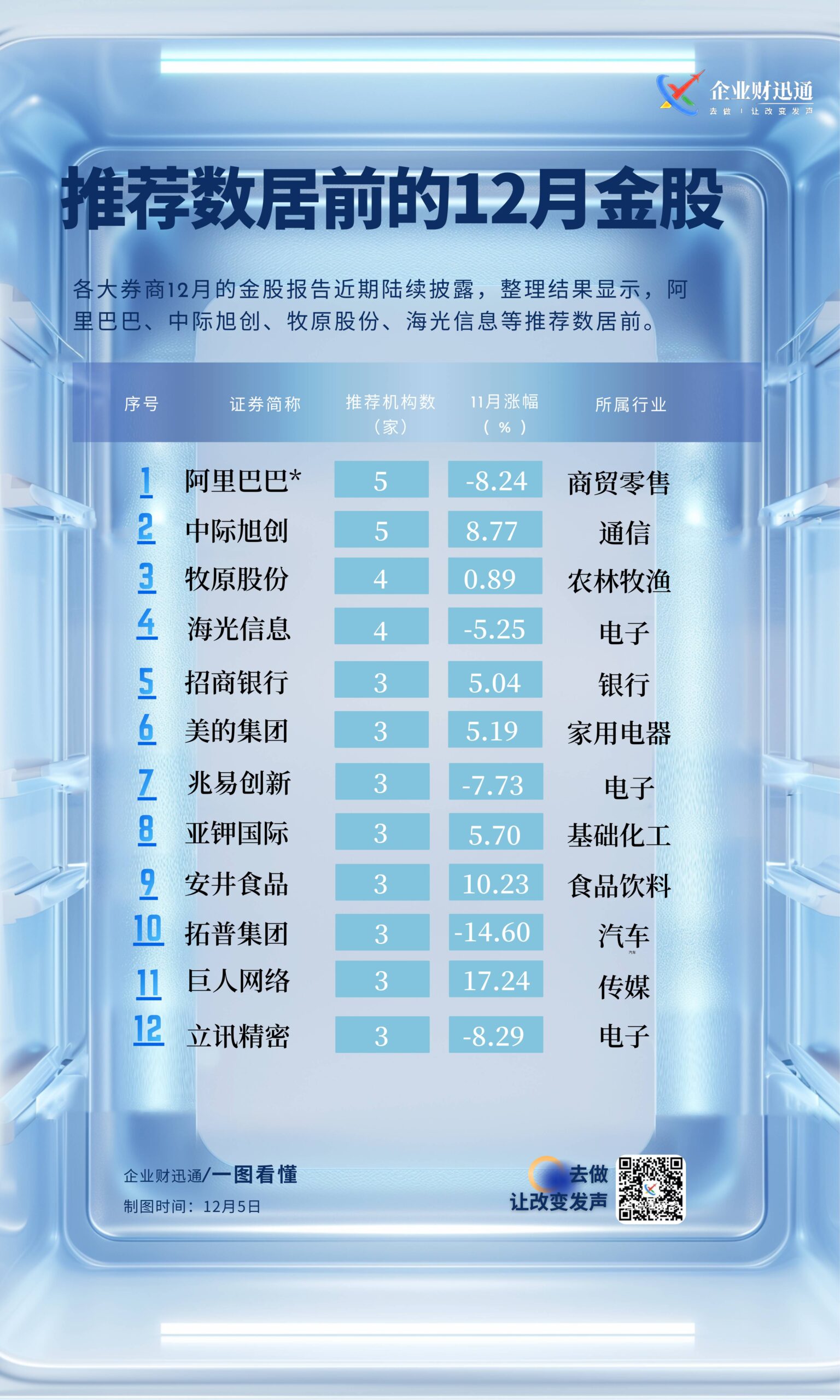 2025 年 12 月券商推荐靠前的金股名单,核心信息如下: