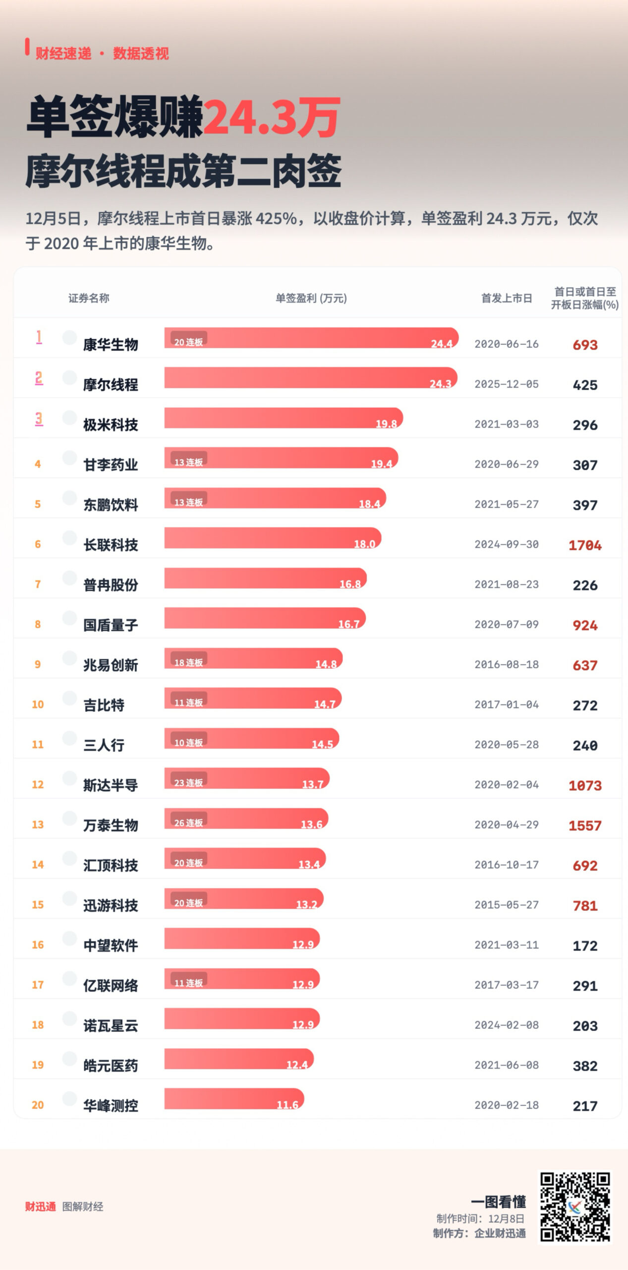 12 月 5 日上市的摩尔线程首日暴涨 425%,单签盈利 24.3 万元,成为 A 股历史第二肉签,仅次于 2020 年上市、单签盈利 24.4 万元的康华生物。