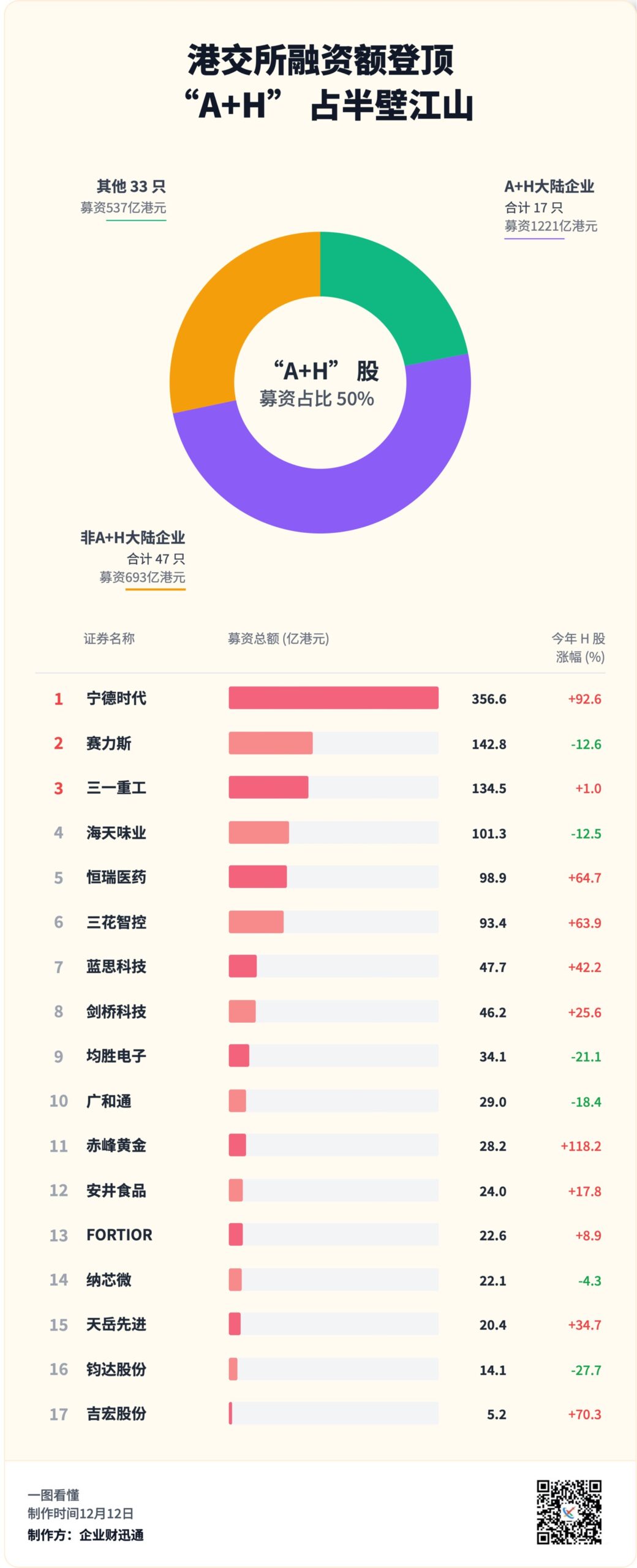 融资占比:“A+H” 股在港交所融资额中占比达 50%(17 只 A+H 大陆企业募资 1221 亿港元),其余为 47 只非 A+H 大陆企业(募资 693 亿港元)和 33 只其他企业(募资 537 亿港元)。 A+H 企业详情:列出 17 家 A+H 大陆企业的募资额及今年 H 股涨幅,其中宁德时代募资 356.6 亿港元(涨幅 + 92.6%)居首,赤峰黄金涨幅最高(+118.2%),部分企业如赛力斯、钧达股份等涨幅为负。