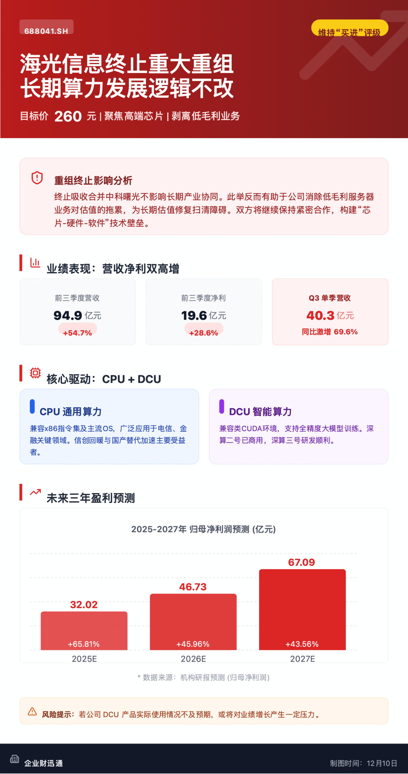 12 月 9 日晚间,海光信息(688041.SH)发布公告称,公司董事会已审议通过终止换股吸收合并曙光信息产业股份有限公司并募集配套资金暨关联交易的议案,此消息引发市场关注。针对该事件,群益证券(香港)随即发布研报,重申对海光信息 “买进” 评级,目标价 260 元,强调短期股价或受扰动,但长期国产算力核心逻辑未受影响。