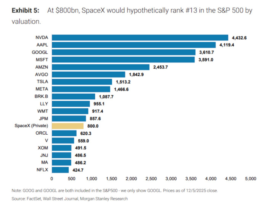 大摩指出,若将SpaceX纳入标普500指数,其8000亿美元的市值可位列第13名,紧随摩根大通之后,领先于甲骨文。