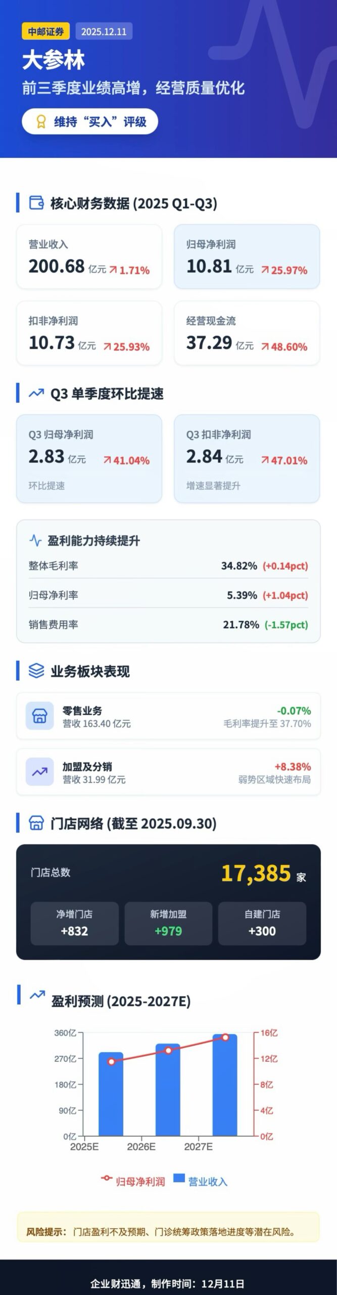 2025 年 12 月 11 日,中邮证券发布医药生物行业公司点评报告,维持大参林 “买入” 评级。报告显示,大参林 2025 年前三季度业绩实现高速增长,盈利能力与经营质量同步提升,各业务板块呈现差异化向好态势。