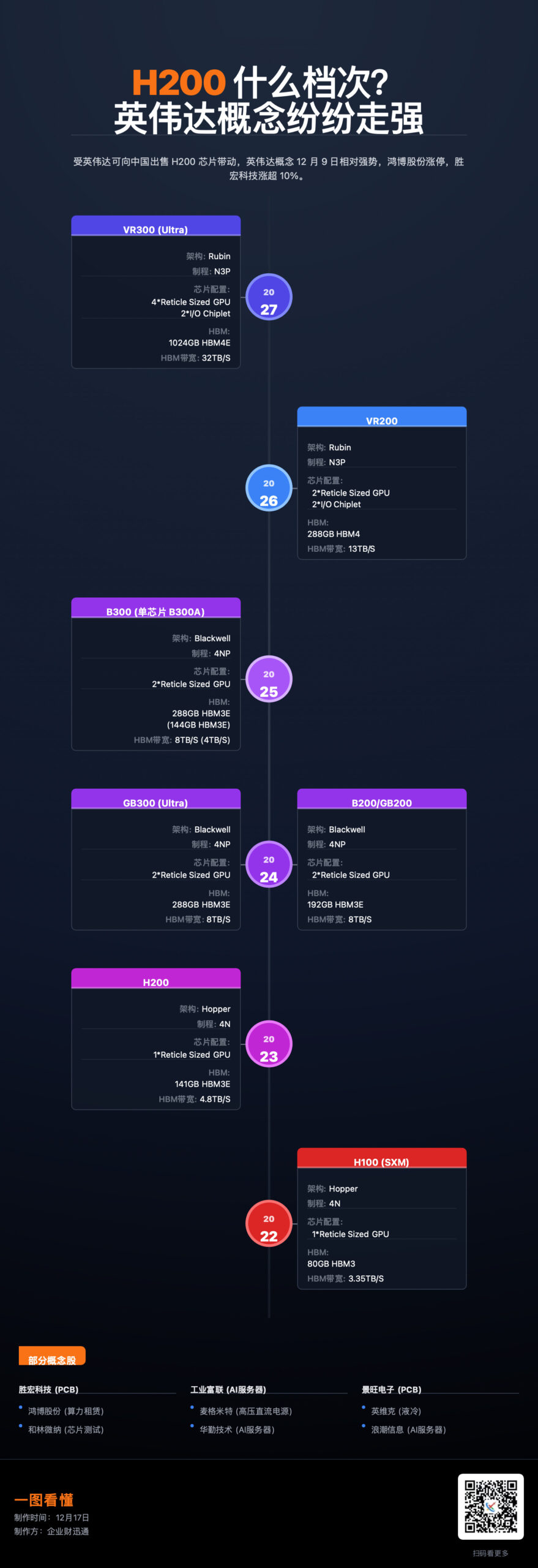 受英伟达向中国出售 H200 芯片带动”,12 月 9 日英伟达概念股走强(如鸿博股份涨停、胜宏科技涨超 10%),并列出了部分英伟达概念股(含 PCB、算力租赁、AI 服务器等细分领域,如胜宏科技、鸿博股份等)。