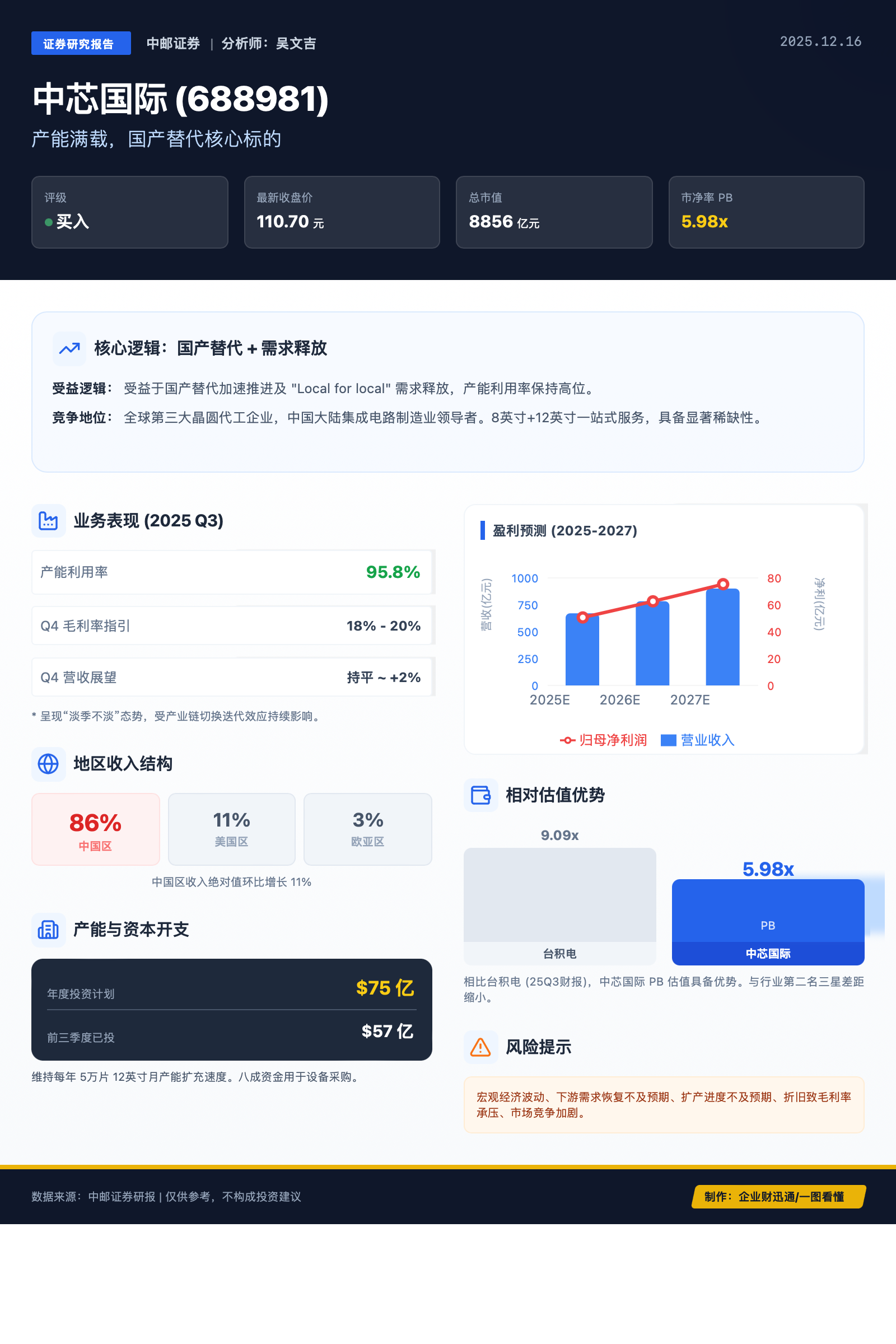 2025 年 12 月 16 日,中邮证券发布研究报告,维持中芯国际 “买入” 评级。作为中国大陆集成电路制造业领导者,公司凭借国产替代红利与持续的产能扩张,展现出强劲的发展韧性与增长潜力。
