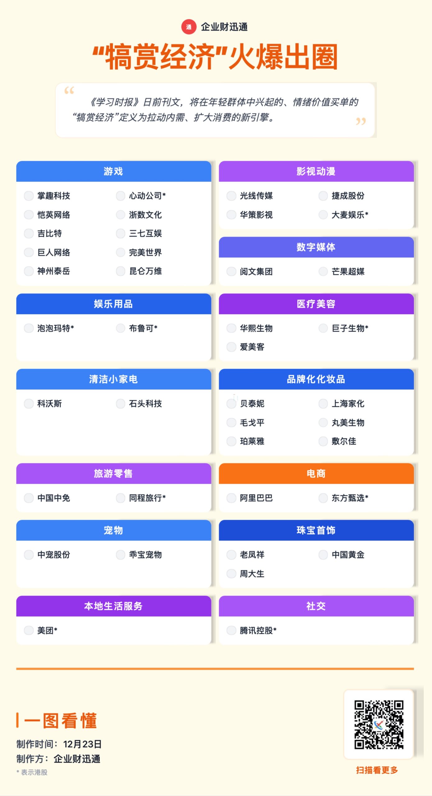核心:《学习时报》将年轻群体中 “为情绪价值买单” 的 “犒赏经济” 定义为拉动内需的新引擎,列出该经济涉及的多个领域及对应企业: 涵盖游戏(如掌趣科技)、影视动漫(如光线传媒)、数字媒体(如阅文集团)等 12 个领域; 每个领域下包含多家相关企业(部分标注 “*” 为港股),比如娱乐用品领域有泡泡玛特,电商领域有阿里巴巴等。