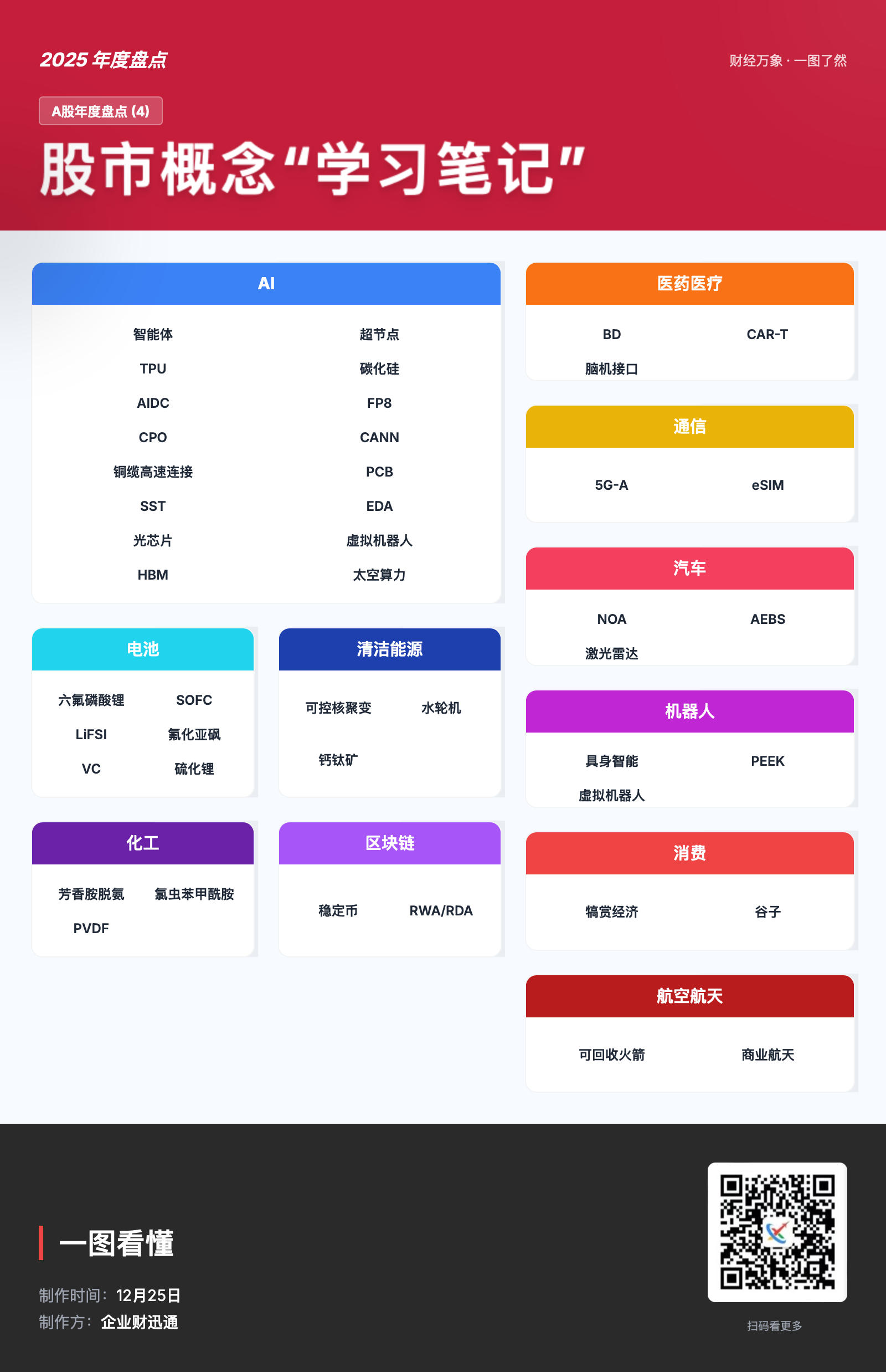 2025 年 A 股年度盘点的 “股市概念学习笔记” 图,按 AI、医药医疗、通信等 8 大领域,梳理了当年热门的股市细分概念(比如 AI 领域的智能体、HBM,汽车领域的 NOA 等),是一份 2024 年 A 股热门概念的汇总清单,方便快速了解全年市场热点方向。