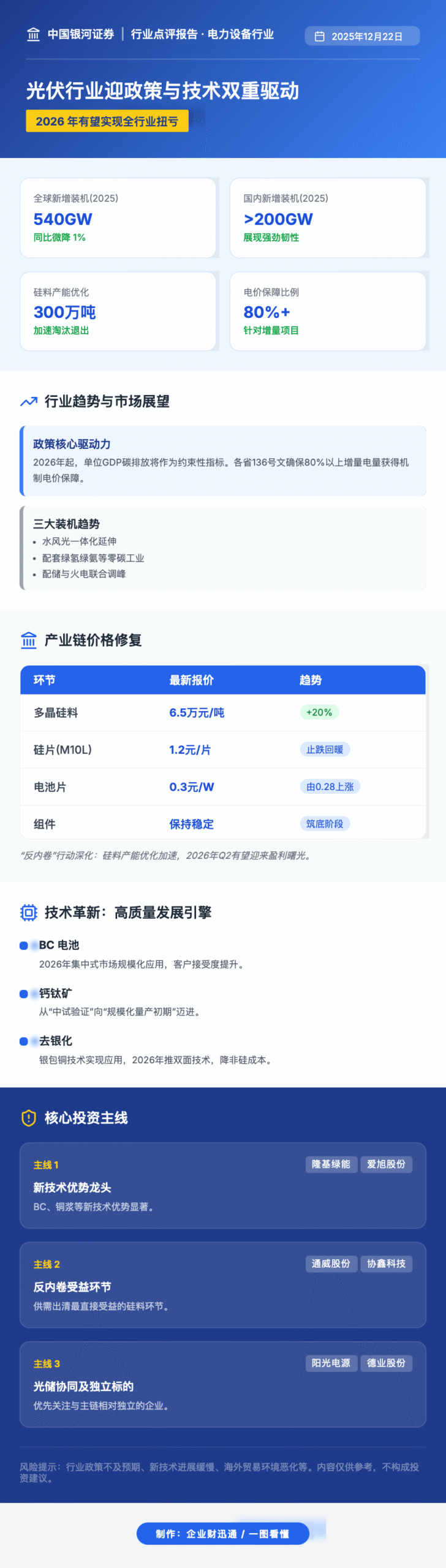 中国银河证券指出,光伏行业已进入政策护航与技术驱动的新发展阶段,建议关注三大投资主线:一是 BC、铜浆等新技术优势显著的龙头企业,如隆基绿能、爱旭股份等;二是反内卷政策中最受益的硅料环节,包括通威股份、协鑫科技等;三是光储协同优先、与主链相对独立的企业,如阳光电源、德业股份等。同时,需警惕行业政策不及预期、新技术进展缓慢、海外贸易环境恶化等潜在风险。