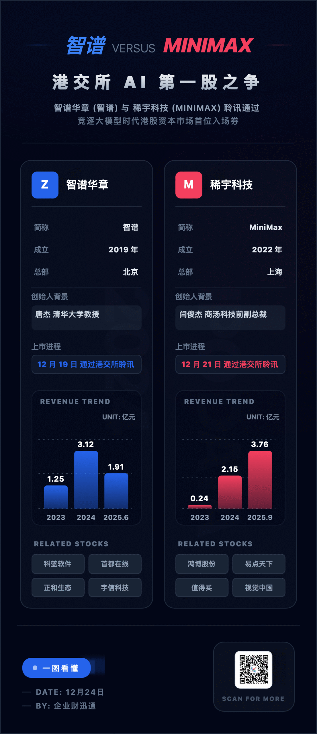 财务数据方面,智谱 2022 年至 2025 年 6 月底营收分别为 0.57 亿元、1.25 亿元、3.12 亿元、1.91 亿元,同期亏损 1.44 亿元、7.88 亿元、29.58 亿元、23.58 亿元;MiniMax 2022 年无营收,2023 年至 2025 年 9 月底营收为 0.24 亿元、2.15 亿元、3.76 亿元,同期亏损 18.95 亿元、32.75 亿元、36.04 亿元。