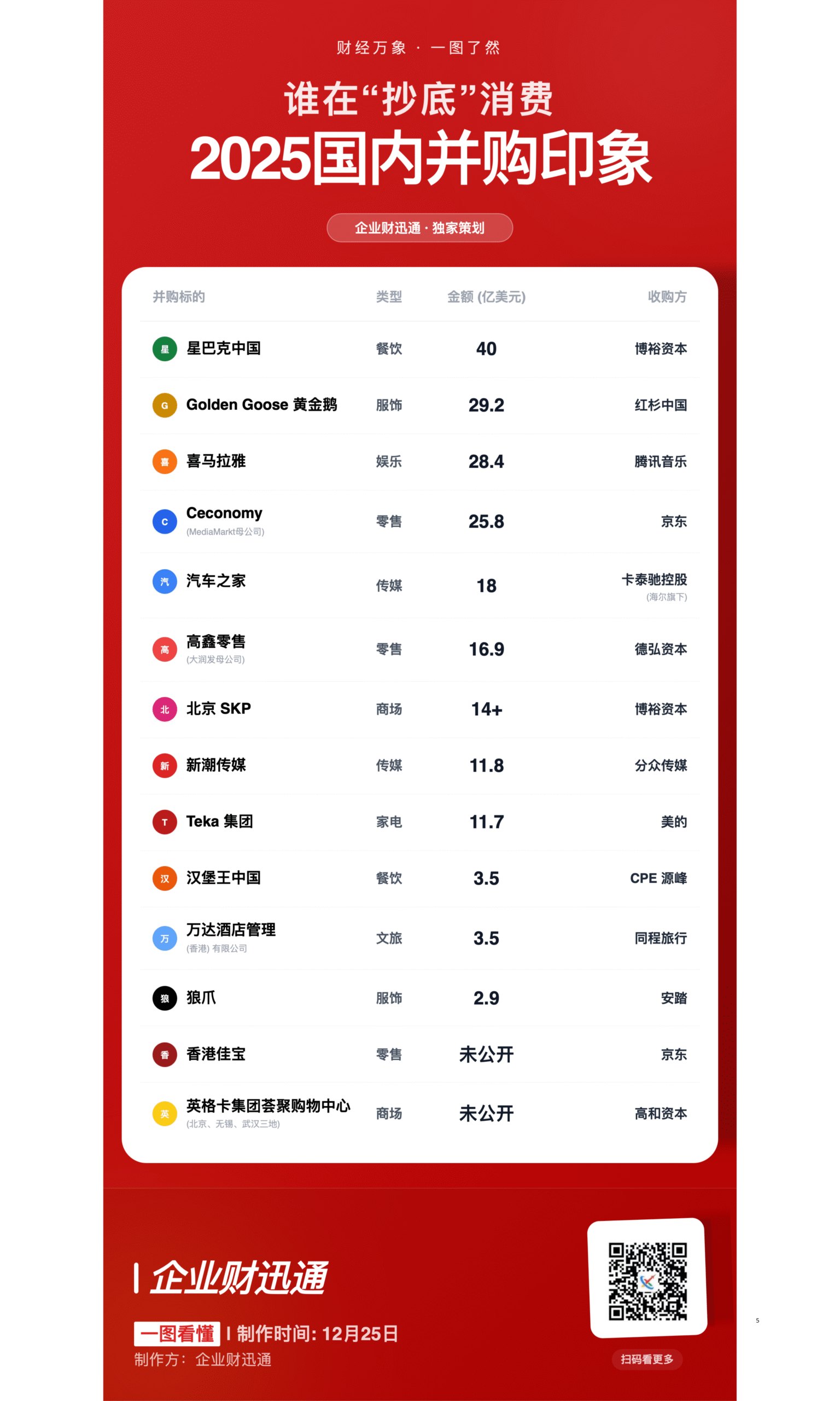 2025 年国内消费赛道并购热潮持续升温,近期红杉中国收购意大利奢牌黄金鹅、瑞幸拟收购蓝瓶等高端咖啡品牌引发关注。全年重磅并购频现:资本层面,博裕收购星巴克中国 60% 股权、北京 SKP 部分股权,CPE 源峰注资汉堡王中国,高和资本与英格卡合作持有三座荟聚中心;企业层面,京东收购欧洲 CECONOMY、香港佳宝超市,同程收购万达酒店管理公司,腾讯音乐并购喜马拉雅,美的、海尔分别收购欧洲厨电品牌 Teka、汽车之家股权,安踏收购德国狼爪,分众传媒收购新潮传媒。这一布局背后有扎实消费基本面支撑,尼尔森 IQ 数据显示,2025 年 1-9 月中国非食品类快消品销售额同比增长 9.3%,消费者信心回升,消费结构优化,对品质和体验需求提升。