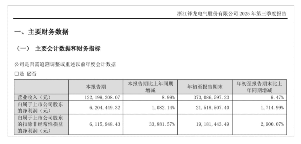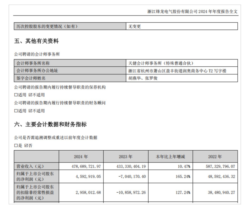 锋龙股份近年的业绩表现波动较为明显。2022年至2024年,公司实现营业收入分别约为5.87亿元、4.33亿元、4.79亿元;对应实现归属净利润分别约为4859.24万元、-704.02万元、459.29万元。