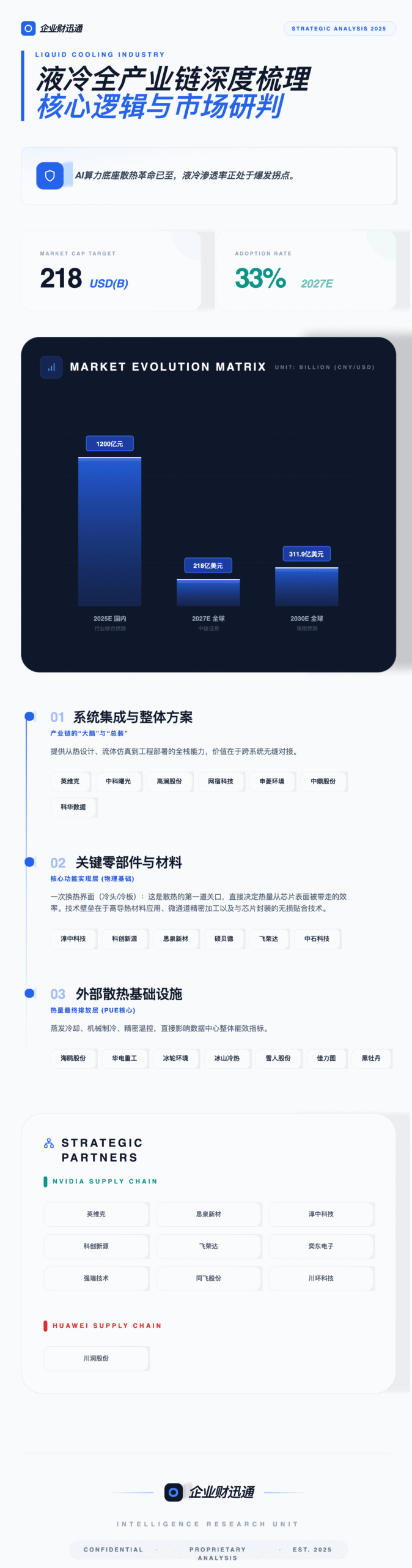 市场预测:2027年全球液冷市场预计达218亿美元(中信证券);2030年全球直接液体冷却市场预计达311.91亿美元(瑞银);国内2025年液冷市场规模将破1200亿元,AI服务器液冷渗透率33%。2025年底行业进入需求与业绩双兑现期,国产替代加速,冷板与浸没式技术双轮驱动。