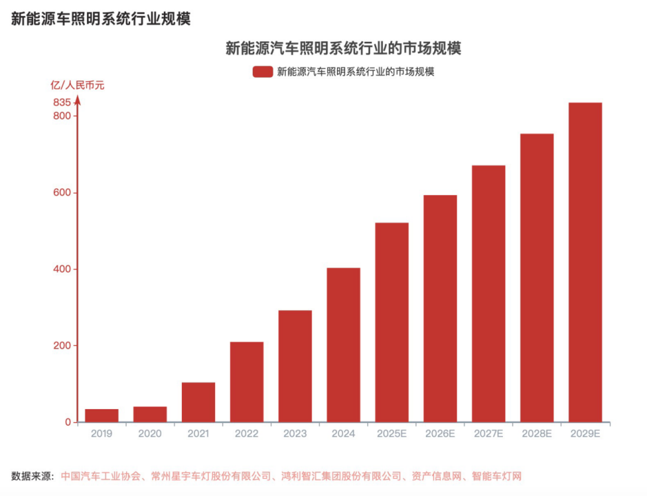 新能源车照明系统行业规模在过去几年实现了爆发式增长,2019年至2024年市场规模从34.24亿元激增至403.01亿元,复合增长率高达63.74%。展望未来,市场将在更高基数上保持稳健增长,预计到2029年规模将增长至834.62亿元。