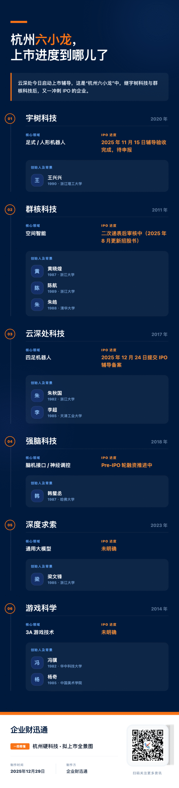 云深处成为继群核科技、宇树科技之后,又一家启动IPO进程的“杭州六小龙”企业。“杭州六小龙”聚焦机器人、AI、脑机接口、游戏等前沿领域,包括云深处科技、宇树科技、群核科技、强脑科技、深度求索和游戏科学。