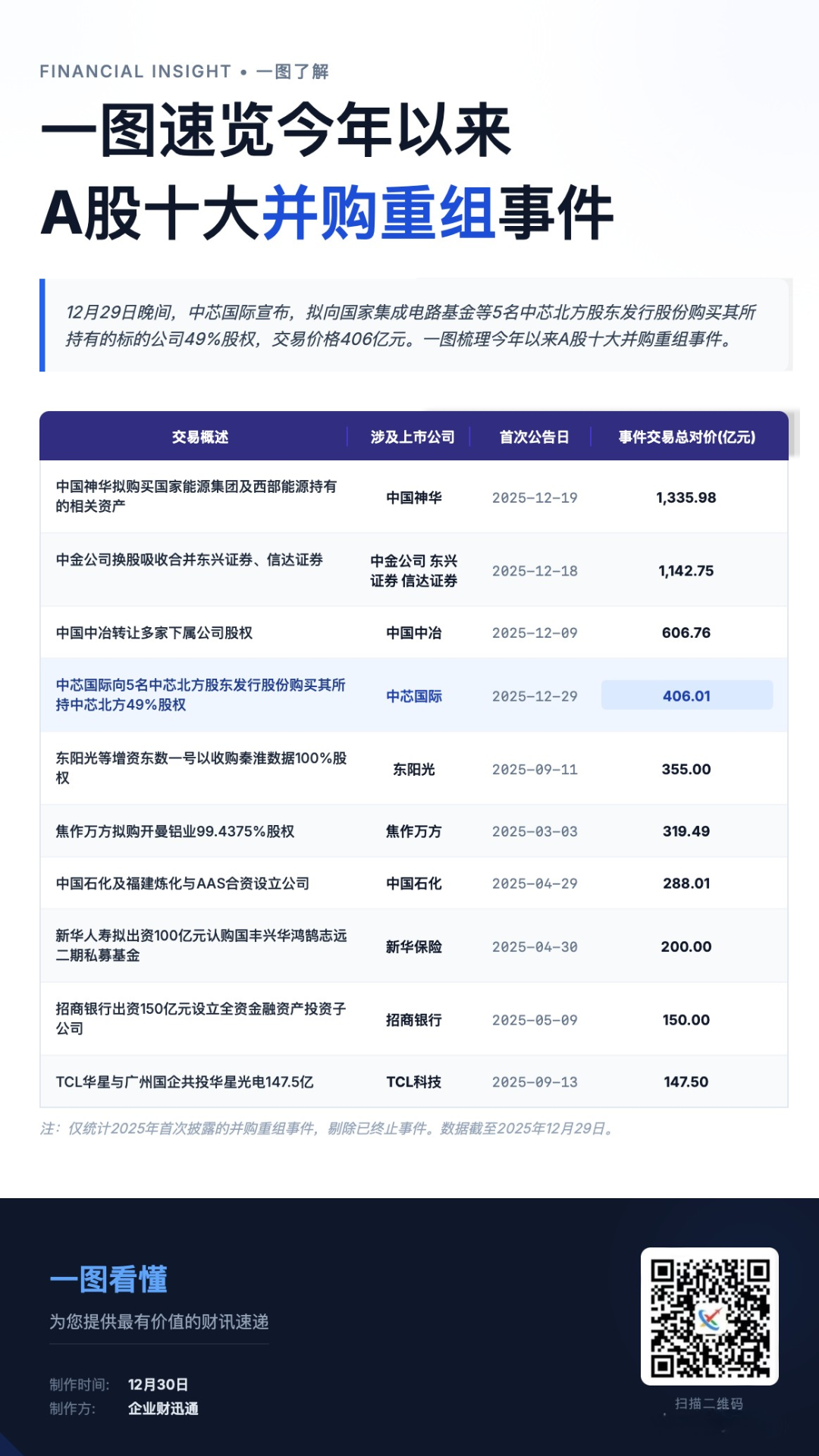 今年以来A 股并购重组盘点,包含交易概述、涉及上市公司、首次公告日及交易总对价: 交易规模最大的是中国神华收购相关资产(1335.98 亿元),其次是中金公司换股吸收合并东兴、信达证券(1142.75 亿元); 最新事件是 12 月 29 日中芯国际拟 406 亿元收购中芯北方 49% 股权; 覆盖能源、金融、半导体等行业,交易对价从 147.5 亿元到超千亿不等。